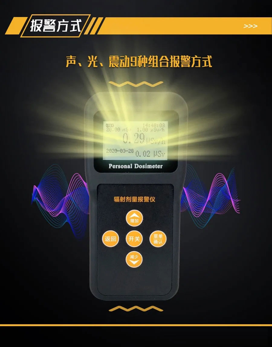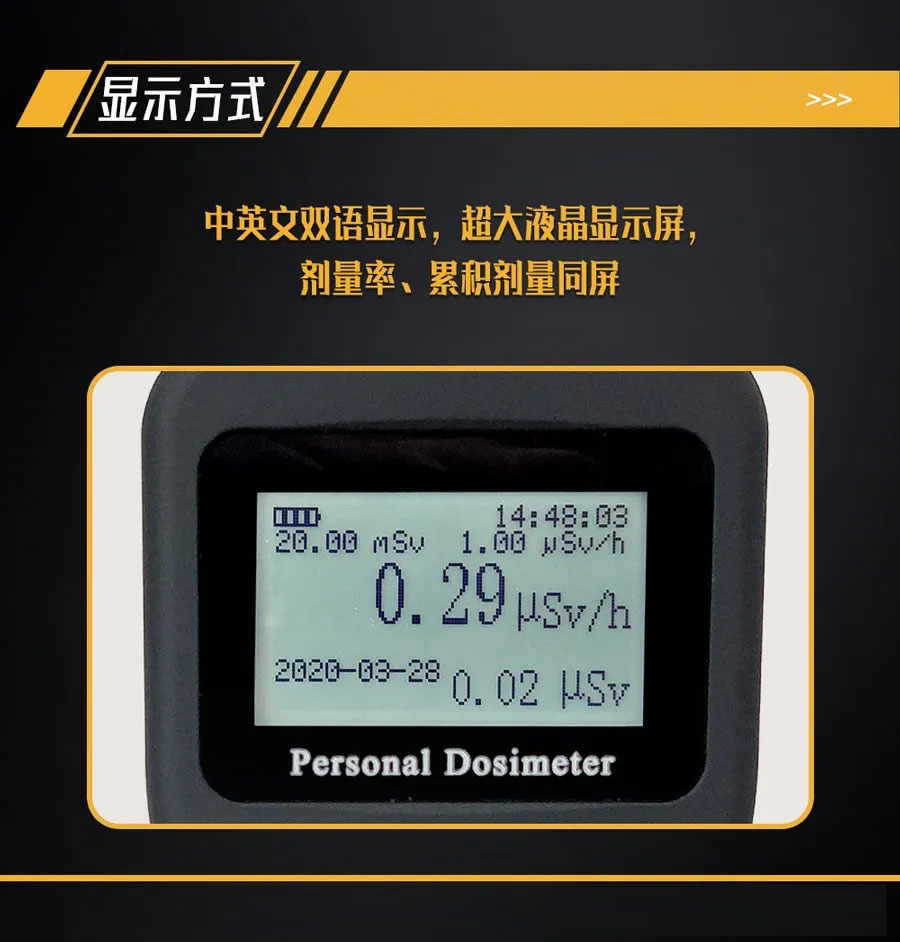 5、显示方式:中英文双语显示,超大液晶显示屏,剂量率、累积剂量同屏显示;