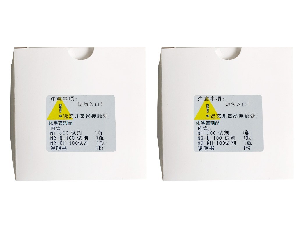将整瓶片状N2—N倒入烧杯中,加入50ml无氨水,搅拌溶解,充分冷却至室温。另将整瓶N2—KH粉末试剂全部倒入烧杯中,加入10ml无氨水,搅拌使其充分溶解,然后将此溶液在搅拌下徐徐注入充分冷却的N2—N溶液中,用水稀释至100ml,静置5个小时以上,小心倒出上清液待用。此溶液储存于棕色聚乙烯瓶中,用橡皮塞或聚乙烯盖盖紧,低温冷藏储存。如发现有大量沉淀或试剂颜色变深,对测定结果有很大影响,应重新配制。